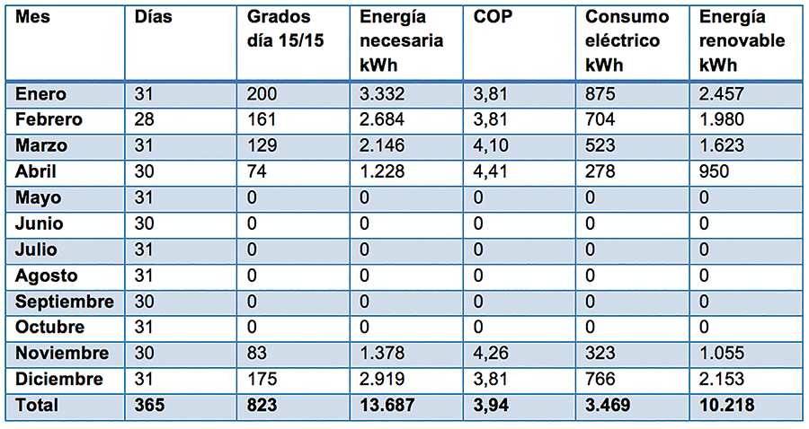En la tabla tenemos los consumos eléctricos mensuales, teniendo en cuenta que el rendimiento del equipo varía en función de la temperatura exterior.