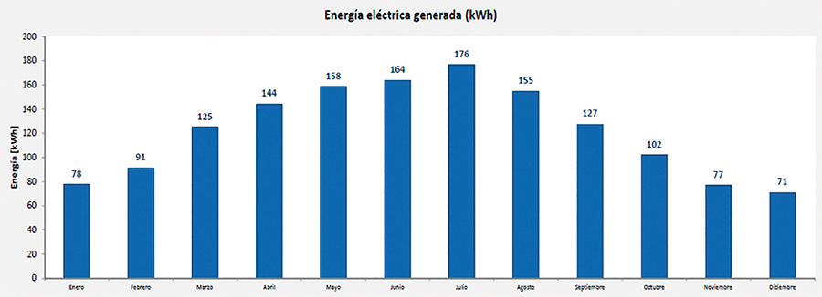 La energía eléctrica total que genera la instalación fotovoltaica es de 1.468 kWh (206 €). En la gráfica siguiente están los datos por meses:
