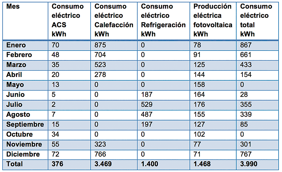 En la tabla posterior se puede ver el consumo eléctrico estimado en los diferentes usos, así como la producción energética de la instalación solar fotovoltaica.