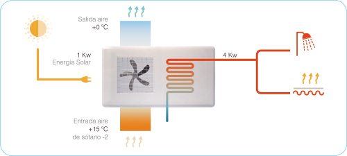 • En condiciones normales, la bomba de calor aerotérmica produce la energía que se utilizarán para ACS y calefacción del edificio, teniendo en cuenta que la eficiencia del sistema tiene un Scop entre 3 y 4.