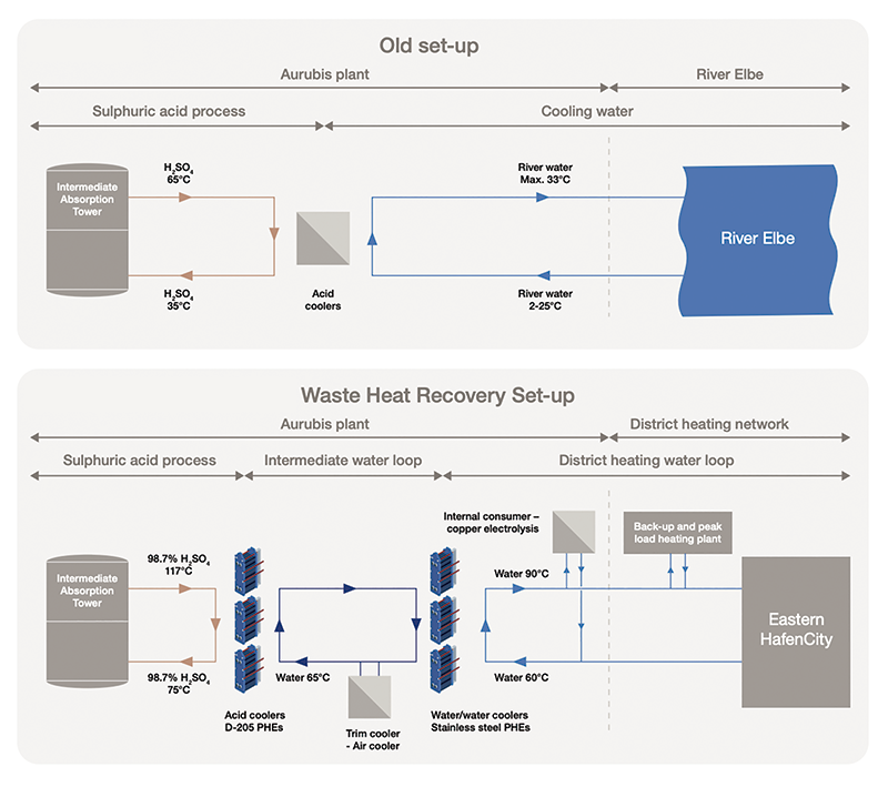 El ácido sulfúrico se diluye continuamente en el proceso. La dilución del ácido es un proceso altamente exotérmico, que libera importantes cantidades de calor. Gracias al GPHE de Alfa Laval, Aurubis puede recuperar este calor para utilizarlo en la calefacción urbana.