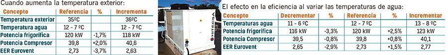 Para una enfriadora de agua condensada por aire, 120 kW, con refrigerante R410A, compresores Scroll y temperatura exterior 35ºC.