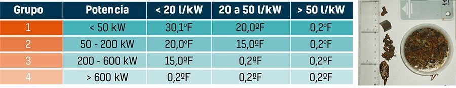 Prescribe los siguientes valores límites de dureza del agua (en grados franceses, ºF), según potencia total y contenido de agua en la instalación. Si se superan, hay que tratar el agua.