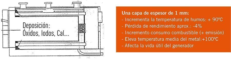 Al ser el punto de aporte de energía a la instalación, la presencia de óxidos, lodos, calcio… crea una depositación de los mismos sobre los tubos y paredes del lado agua del generador.