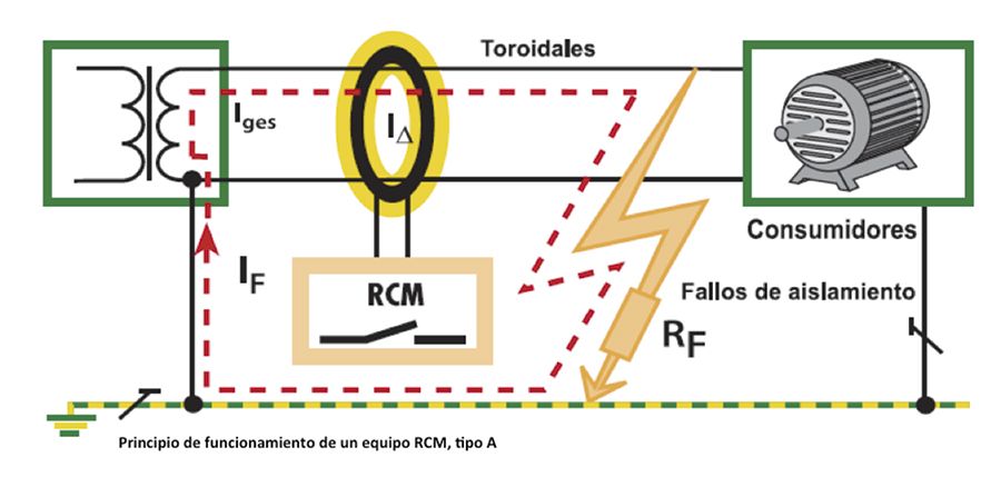 Si fluye una corriente de error (IF) sobre tierra o por otras vías, la diferencia de corriente genera en el toroidal una corriente que es registrada por el RCM. Este procedimiento de medida tiene validez para RCM, para corrientes alternas puras o respectivamente para corrientes continuas pulsantes (Tipo A según IEC 60755).