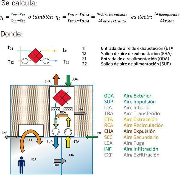 La Eficiencia térmica de un sistema de Recuperación de Calor (ηt) expresa la razón entre la elevación de temperatura del aire impulsado y la bajada del aire extraído, medida en seco (sin condensación), es decir la energía que se recupera respecto de la máxima que se podría conseguir.