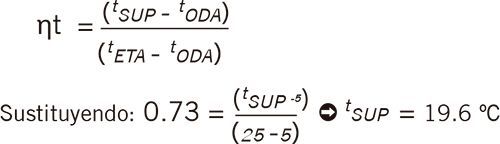 A modo de ejemplo, vamos a calcular las condiciones de impulsión Tª SUP del aire de un recuperador con una eficacia conforme a la ErP 2018 del 73%, en condiciones según EN 308 que trabaja con caudales equilibrados.