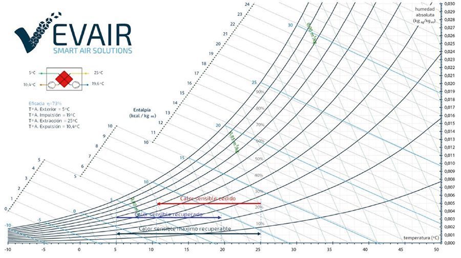 El salto térmico del aire exterior ha sido de Δt=+14,6ºC. Por simplificar, hemos considerado una humedad relativa del aire extraído baja, de esta manera al no haber condensación del aire de extracción en el recuperador, el enfriamiento es sensible y el balance de energía nos produciría el mismo salto térmico en esta corriente: Δt=-14,6ºC. Es decir, el aire de extracción saldría del recuperador a 25ºC-14,6ºC=10,4ºC.