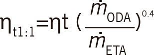 Es también de gran importancia considerar que cuando un recuperador ha sido diseñado con una corriente de extracción mucho menor que la corriente de aire exterior, determinar su funcionamiento con caudales equilibrados no es sencillo, sobre todo en el caso de baterías recuperadoras. Cuando esto ocurre, el valor de eficiencia para caudales equilibrados (ηt(t 1:1)) se puede obtener a partir del valor medido (ηt) de la siguiente manera, donde m representa el caudal másico de aire: