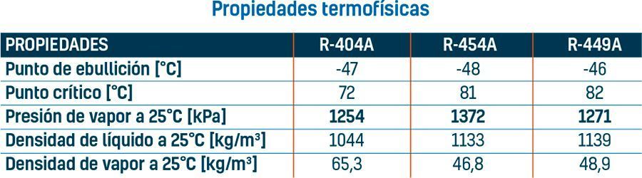 La comparación de propiedades termo-físicas del R-454A y R-449A con respecto al R-404A se muestran en la Tabla V, a continuación. Los puntos de ebullición son muy similares y los puntos críticos de R-454A y R-449A son más elevados que en el R-404A, lo cual es favorable en zonas cálidas. Las presiones de vapor y densidades líquidas también son similares. Las densidades de vapor de R-454A y R-449A son ligeramente inferiores a la del R-404A, lo que reducirá el índice de flujo másico.