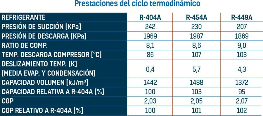 Tanto R-454A como R-449A muestran ratios de compresión y presiones comparables a los de R-404A. Ambos poseen deslizamientos de temperatura mayores que el R-404A, pero comparables a algunos refrigerantes comerciales que se utilizan en la actualidad, en torno a 4,5 K. Las temperaturas de descarga del compresor también son algo mayores que las del R-404A; no obstante, la capacidad frigorífica y la eficiencia energética son casi parejas a la del R-404A (un poco superior en el caso del R-449A).