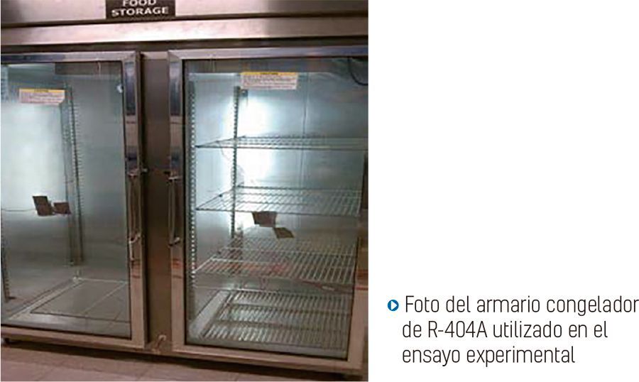 Para medir las prestaciones de sistema de R-454A y R-449A en un sistema, se seleccionó temperatura constante. El congelador es una unidad de doble puerta de 1,5 m3 diseñada para R-404A, con carga de refrigerante de 1,15 kg. Posee un compresor de pistón que utiliza un lubricante de polioléster (POE) de 32 centistokes. Se estableció un ensayo que se adaptara lo más posible a la norma AHAM HRF-1-2008 sobre Energía y Volumen Interno de Dispositivos de Refrigeración (AHAM 2008). No fue posible utilizar la norma 72 de ANSI/ASHRAE porque no se había establecido un sistema para que las puertas del congelador se abrieran y cerraran durante el ensayo. El armario congelador se controla con dos válvulas de expansión termostáticas.