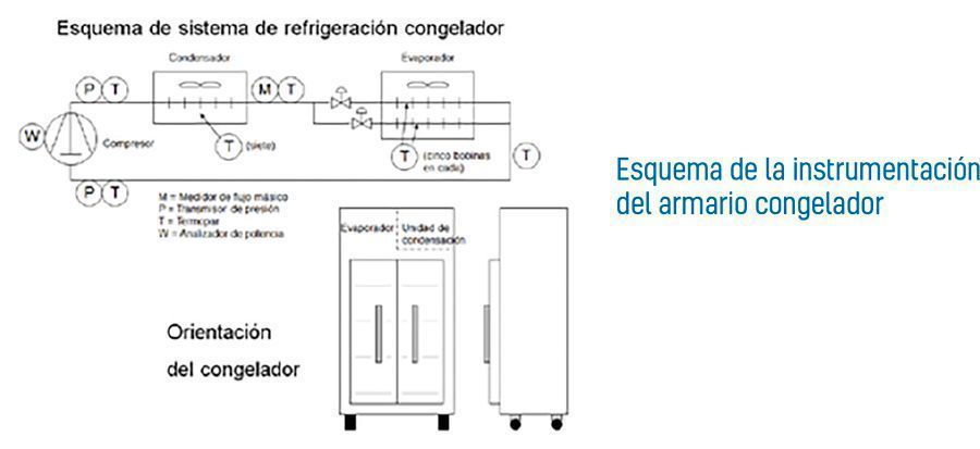 El congelador vacío (según AHAM HRF-1-2008) se situó en una sala de temperatura constante y plenamente equipado con sistemas de medida de temperaturas (T), presiones (P), índice de flujo másico (M) y energía (W), según se muestra en la siguiente figura. No se requirió control de humedad en la cámara (según la sección 5.3.2 de la norma). Los ensayos en cada condición para cada refrigerante se repitieron tres veces para garantizar que los resultados se reproducían y que ninguna variación de humedad afectaba a los resultados.