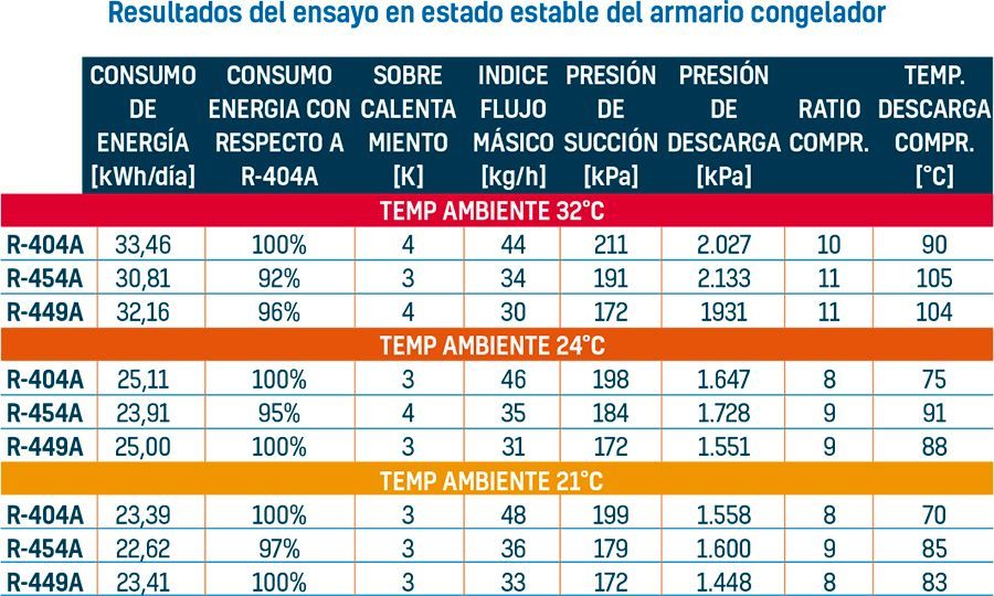 Se llevaron a cabo ensayos en tres condiciones ambientales según establece la norma, a 32°C, a 24°C y a 21°C. Primero se hizo un ensayo de referencia con el R-404A con las tres condiciones ambientales. En cada una, el sobrecalentamiento del evaporador se controló ajustando la válvula de expansión a 3-4K. El sobrecalentamiento en la evaporación se calculó desde la presión de succión y la lectura de temperatura a la salida del evaporador. La temperatura media en el interior del compartimento del congelador (media de cuatro lecturas del termopar situadas en todo el compartimento del congelador) se controló a - 17°C. Se diseñó un ciclo del compresor que permitiera mantener el conjunto de la cabina a una temperatura punta. Las temperaturas y presiones se dan como media sólo cuando el compresor estaba en funcionamiento. Tras el ensayo, se sustituyó el R404A por R-454A y después por R-449A. En cada ensayo, se eliminó el lubricante del sistema y se añadió una nueva carga del mismo tipo de lubricante POE. No se hicieron otros cambios, salvo el ajuste del sobrecalentamiento del evaporador con la válvula de expansión para que se igualara a las condiciones de sobrecalentamiento del R-404A. Para los dos refrigerantes, se cerraron una vuelta las válvulas de expansión.