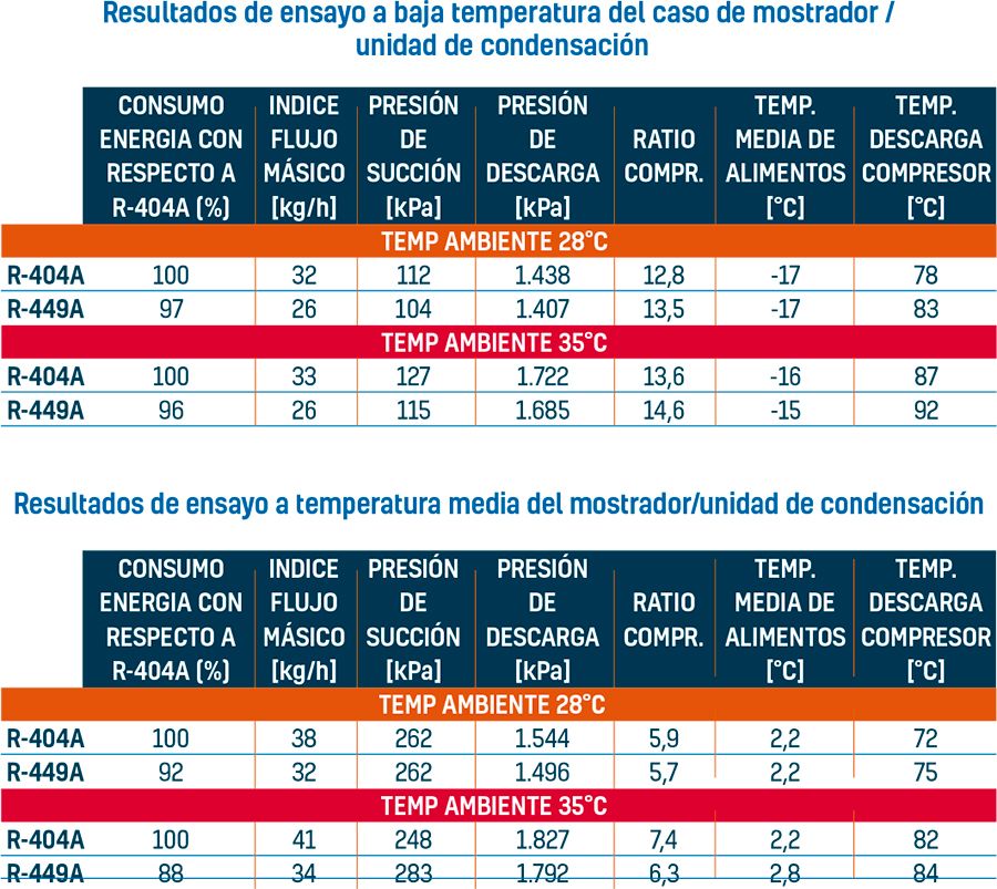 Los resultados experimentales para la unidad de condensación con mostrador frigorífico muestran que el R-449A presenta prestaciones similares en comparación con el R-404A, en condiciones de temperatura baja y media, demostrando ambos mejor eficiencia energética, especialmente en condiciones ambientales más elevadas. Los resultados de ensayo muestran que el R-449A consumió un 3-4% menos de energía en temperatura baja y un 8- 12% en temperatura media. La presión de succión fue en ambos casos similar a la del R- 404A y la presión de descarga inferior en ambas condiciones. El índice de flujo másico fue ligeramente inferior y la temperatura de descarga ligeramente superior. No obstante, las temperaturas de descarga del R-449A se mantuvieron suficientemente bajas como para que no precisara una inyección de líquido que se precisa normalmente en temperaturas superiores a 125°C. Los ratios de sobrecalentamiento del evaporador y compresión fueron también similares a los del R-404A.