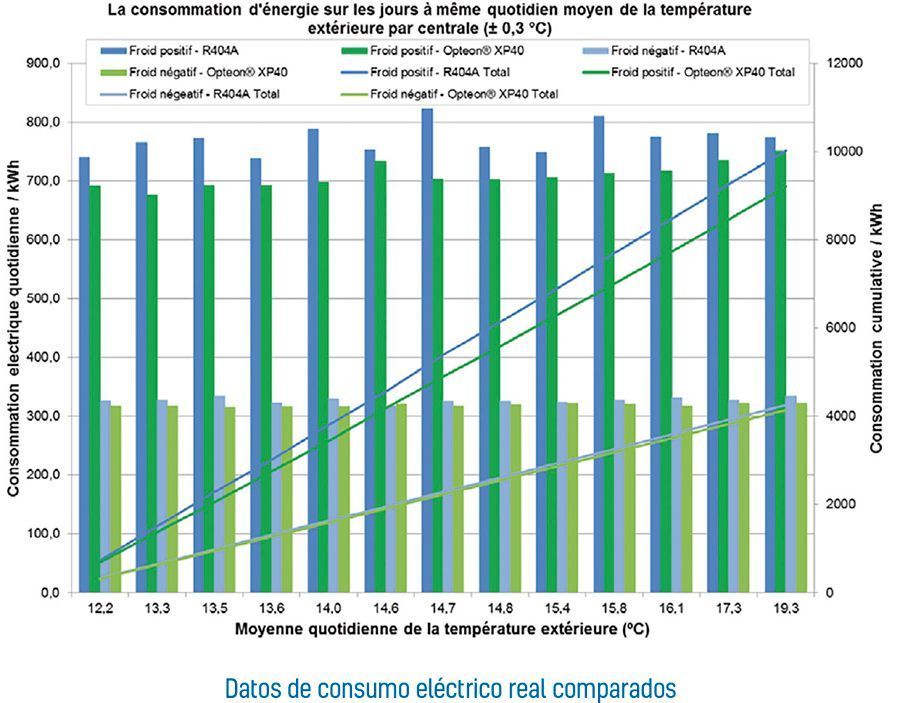 Los resultados medidos de consumo eléctrico son los mostrados a continuación. En ellos podemos ver datos comparativos de consumo eléctrico tanto de las centrales de temperatura positiva como de la de temperatura negativa. En el caso de las centrales de positiva obtenemos un ahorro energético hasta de un 8,5%, y en el caso de la central de negativa obtenemos un ahorro de hasta un 2,5%, del R-449A respecto al R-404A.