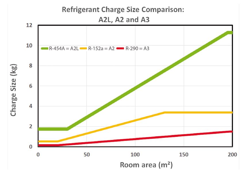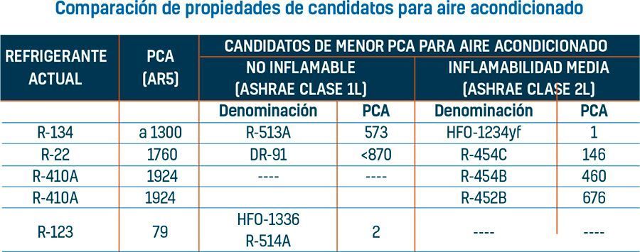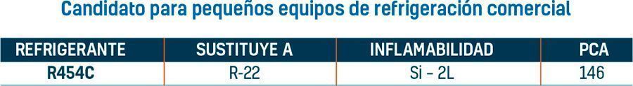 Obsérvese que los candidatos de PCA reducido se clasifican en dos categorías, no inflamable - ASHRAE Clase 1L – y ligeramente inflamable – ASHRAE Clase 2L. Para conseguir la no inflamabilidad y los niveles de capacidad del R-22, la composición DR-91 posee un PCA mayor, pero sigue siendo inferior a 900. Para cumplir con el límite de PCA de 150 y conservar capacidad del nivel del R-22, se propone el refrigerante R-454C, el cual presentará la clasificación ASHRAE 2L por su ligera inflamabilidad.