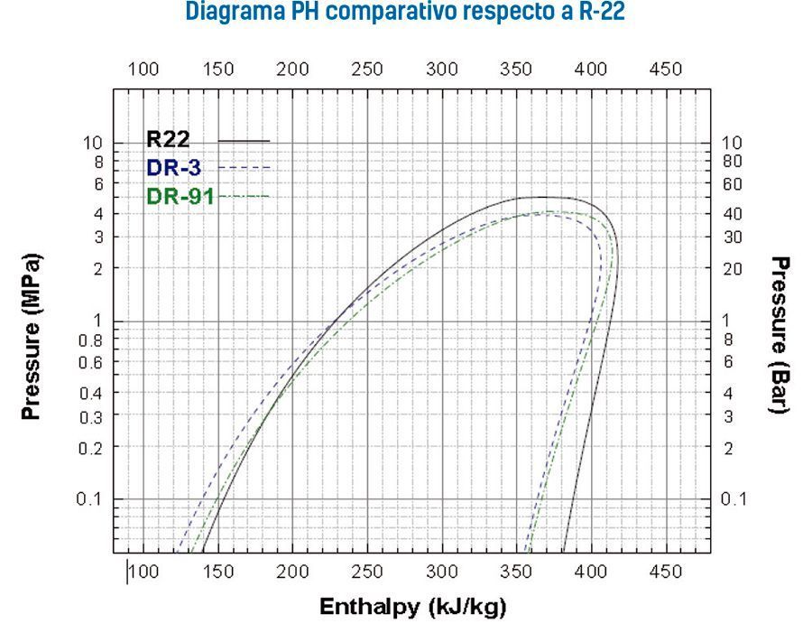 En la Figura 1 se muestra el diagrama de Presión Entalpía (diagrama PH) para R-22, superpuesto a los que han sido desarrollados para los dos sustitutos del R-22, el R-454C y el DR-91. Como se muestra en el diagrama de Presión.