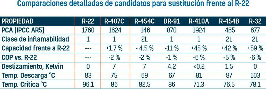 Uno de los sustitutos descritos para R-22 (DR-91) no es inflamable y posee eficiencia energética muy próxima a la del R-22. Su moderado deslizamiento de temperatura lo hace adecuado para su uso en sistemas convencionales con evaporadores y condensadores de expansión directa. La capacidad frigorífica volumétrica está en torno al 11 % menor que la del R-22, por lo que se pueden lograr rendimientos similares utilizando un compresor de velocidad ligeramente superior o un compresor con un desplazamiento un poco mayor. El otro sustituto descrito para el R-22 (R-454C) está optimizado para cumplir límites de PCA directo aún más severos de 150. Este candidato posee una capacidad próxima a la del R-22, pero es ligeramente inflamable (ISO/ASHRAE Clase 2L). Otros refrigerantes (R454B y R- 452B) suponen una mejora sobre el anterior refrigerante de desarrollo, como candidatos para su uso en sistemas de mayor capacidad tipo R-410A.