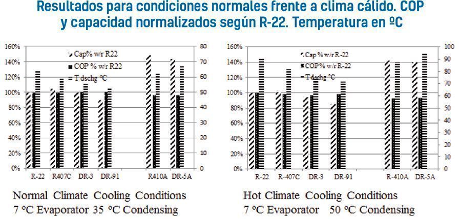 Todos los refrigerantes, tanto R-22 como R-410A, pierden rendimiento en condiciones de temperatura más elevada, pero el grado de pérdida varía según el refrigerante. No obstante, según muestran los datos en el cuadro de barras, a elevada temperatura de condensación, todos los candidatos de PCA reducido R-454C (DR-3), DR-91, y R-454B (DR-5A) poseen mayor COP que el R-410 A. Al ser la eficiencia energética el factor más importante en la reducción del impacto global en las emisiones de carbono, esto es muy significativo. La reducción de capacidad no es tan crítica ya que el uso de un compresor de mayor desplazamiento puede hacer recuperar capacidad volumétrica en un punto deseado. Dicho esto, el R-454B (DR-5A) muestra menor pérdida de capacidad en condiciones cálidas que otros candidatos, lo cual también podría dar un menor consumo energético.