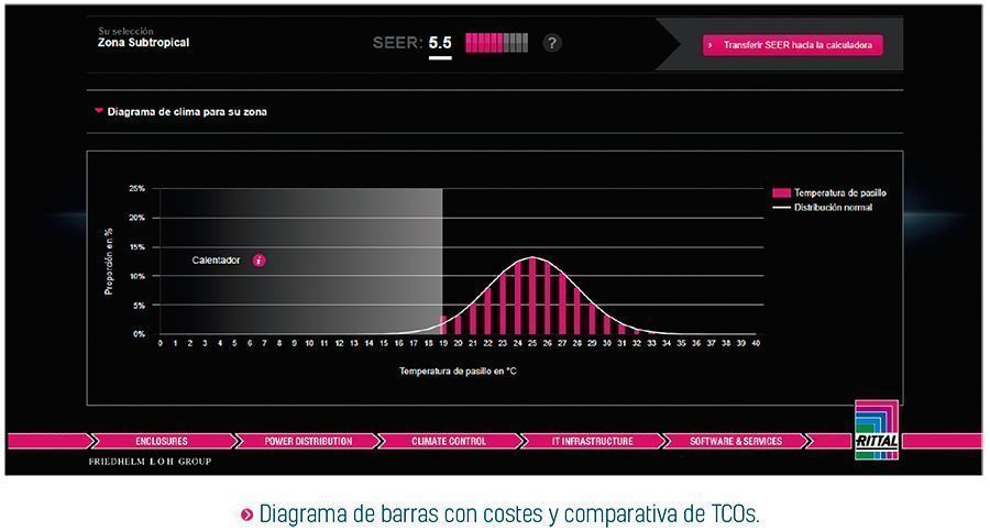 En los cálculos habituales se aplica un EER para una temperatura constante en el recinto de instalación de 35°C, lo cual desestima completamente las fluctuaciones estacionales de la temperatura ambiente. Como estas fluctuaciones son verdaderamente relevantes, el hecho de desestimar las estaciones del año falsea el cálculo. Por esta razón, la herramienta de Rittal utiliza el SEER – Seasonal Energy Efficiency Ratio o factor de eficiencia energética estacional – que es mucho más detallado y considera estas fluctuaciones.