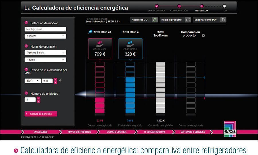 Con la calculadora de eficiencia energética y del TCO, Rittal ayuda a visibilizar los enormes potenciales de ahorro que albergan las modernas refrigeraciones de bajo consumo para armarios de distribución. Gracias al cálculo detallado y comprensible, así como a la representación gráfica clara, se facilita tanto a los operadores de instalaciones como a los proyectistas y compradores técnicos un valioso material argumentativo, que les permitirá justificar y documentar su elección de un refrigerador. Además, no se hace sobre la base de datos de validez general, sino opcionalmente basándose en requerimientos y valores característicos reales - ¡más personalizado, casi imposible!