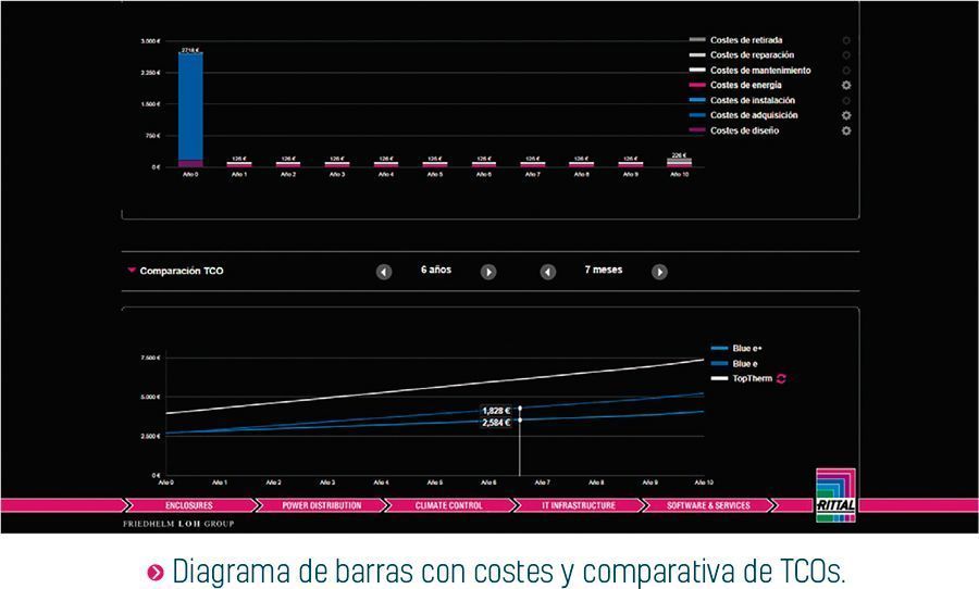 Es decir, que la calculadora del TCO hace posible un análisis muy detallado de los costes totales. Actualmente los costes de diseño, adquisición y energéticos se pueden adaptar de forma personalizada a las condiciones realmente existentes, con el fin de hacer posible un análisis todavía más realista. Y Rittal está trabajando en más posibilidades de personalización.