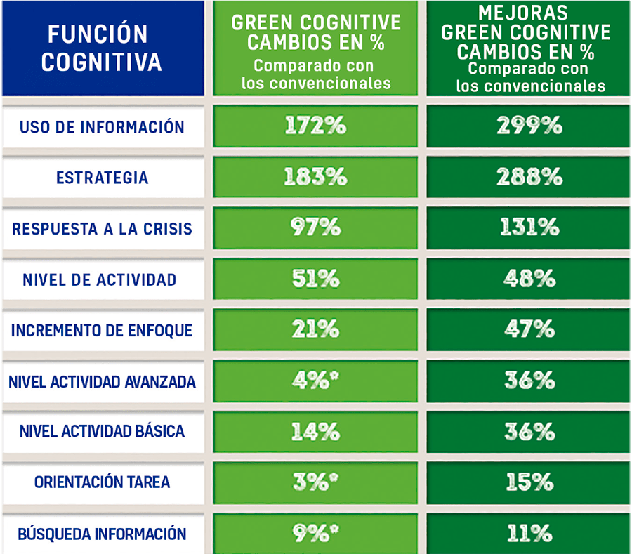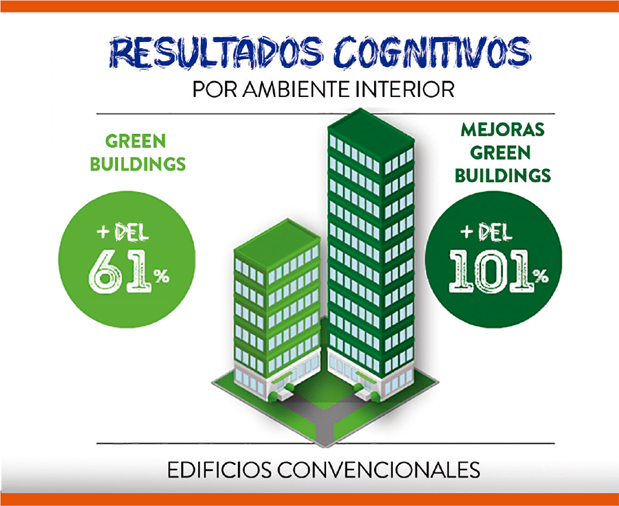 Como media, un diseño “Green Building” en la edificación destinada a oficinas mejora en un 61% los ratios de evaluación de las Funciones Cognitivas frente a oficinas de diseño convencional. En los diseños GB con Ventilación Optimizada, este incremento alcanza el 101%. Las funciones asociadas a la “respuesta ante situaciones de crisis”, “uso de información” o “toma de decisiones” presentan incluso un incremento por encima de la media.