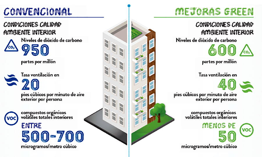 En un edificio Green Building con Certificación LEED, se reportaron un 30% menos de casos médicos asociados a los síntomas que caracterizan al “síndrome del edificio enfermo” (molestias nasales y oculares, dolores de garganta, alteraciones cutáneas, dolores de cabeza, fatiga...) cuando se le compara con edificios similares sin certificar.