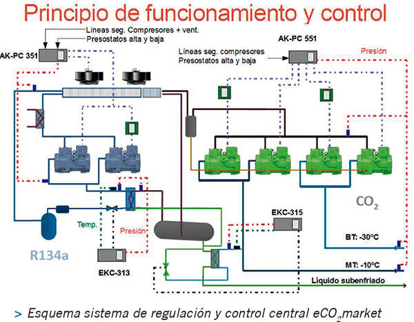 El sistema cuenta además con un economizador o subenfriador de CO2 que mantiene una temperatura de la línea de líquido en torno a -4°C, a la par que proporciona una mejora de rendimiento de la producción frigorífica de baja temperatura.