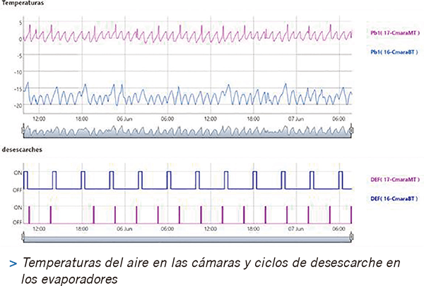 En la Figura se muestra, como ejemplo, el funcionamiento de las cámaras de almacenamiento de MT y BT en base a las temperaturas del aire en el interior de las mismas y de los ciclos de desescarche en los evaporadores. Se puede observar que la cámara de MT conserva una temperatura media de 2ºC, con mínimos en torno a los 0ºC y máximos de 4ºC coincidentes con los ciclos de desescarche. La de BT mantiene la temperatura media sobre los -18ºC, con mínimos de -20ºC y máximos de -14ºC.