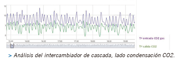 En la Figura se puede observar el comportamiento en el condensador del CO2 o intercambiador de cascada, donde se mantiene de forma prácticamente constante el diferencial de temperaturas.