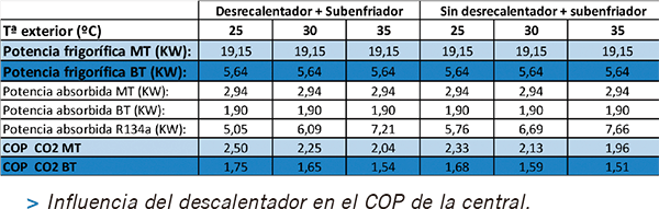 La incorporación del descalentador proporciona una mejora variable en el COP de la central en función de la temperatura exterior, con vabores del 4% en MT y del 2% en BT para 35ºC exteriores y del 7% en MT y del 4% en BT para 25ºC. Con temperaturas exteriores de 5ºC se logra la condensación total del CO2 en la batería, alcanzándose un COP de 5.26 para MT y de 2.57 para BT.