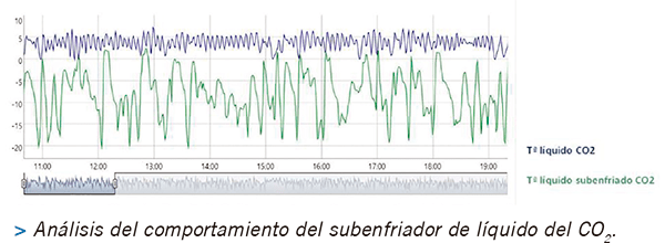 En la Figura podemos verificar el subenfriamiento del líquido conseguido. La temperatura de salida de líquido del intercambiador de cascada se encuentra a una temperatura media en torno a 4ºC; con el uso del subenfriador estamos alcanzando una temperatura media del líquido a la salida de la central de -8ºC, mejorando de forma significativa el rendimiento de la producción frigorífica en baja temperatura.