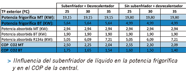 La presencia del subenfriador de líquido se justifica, principalmente, en el mantenimiento de la temperatura de la línea de líquido por debajo de 0ºC, al tiempo que se evita la cavitación. Además, se consigue una mejora de la potencia frigorífica y del COP en baja temperatura en torno al 13% y 10%, respectivamente, a costa de una pequeña reducción de potencia y COP en MT.
