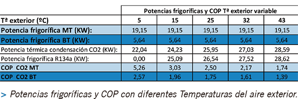 desciende, alcanzándose valores del 7% en MT y del 4% en BT para temperaturas exteriores de 25ºC. Es aún más relevante con bajas temperaturas exteriores, llegando a producirse el 100% de la condensación del CO2 en la batería con temperatura de condensación de 10ºC y exterior de 5ºC y no siendo necesario en este caso el funcionamiento de los compresores del ciclo de alta temperatura.