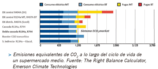 Gracias al bajo consumo energético y a la reducida carga de refrigerante HFC, el sistema ECO2market posee el menor índice TEWI o impacto total equivalente de calentamiento atmosférico de los sistemas analizados. Es compatible con las restricciones del reglamento europeo F-GAS para 2022, siendo elegible para aplicaciones de refrigeración comercial de cualquier potencia.