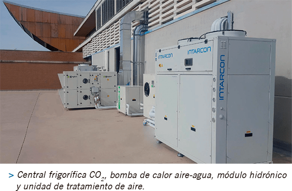 La central frigorífica de CO2 combina la producción frigorífica de frío y clima recuperando, en la medida de lo posible, el calor de condensación del ciclo de alta temperatura de R134a por medio de un intercambiador de placas soldadas, refrigerante-agua. Incorpora el condensador de aire y el cuadro eléctrico de protección y control.
