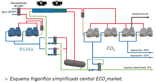 La central frigorífica de CO2 trabaja en ciclo subcrítico con compresores de CO2 con rango de funcionamiento extendido dispuestos en paralelo con doble línea de aspiración en cascada con un ciclo de R134a de alta temperatura para la evacuación del calor, disponiendo de un condensador por aire con motoventiladores axiales.