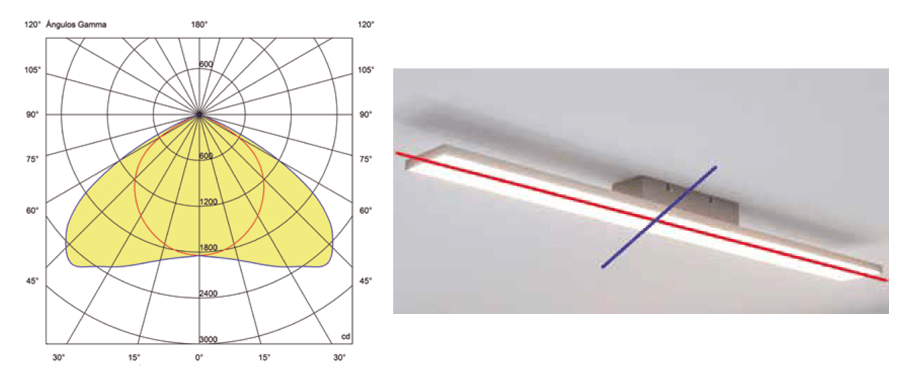 En la siguiente imagen, la curva roja representa el eje 0º-180º y es el eje perpendicular al eje principal de la fuente de la fuente de luz de la luminaria.