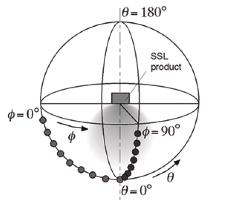 Geometría para la medida de cromaticidad utilizando un goniómetro (la imagen muestra el caso de un producto SSL que emite luz sólo en direcciones descendentes)
