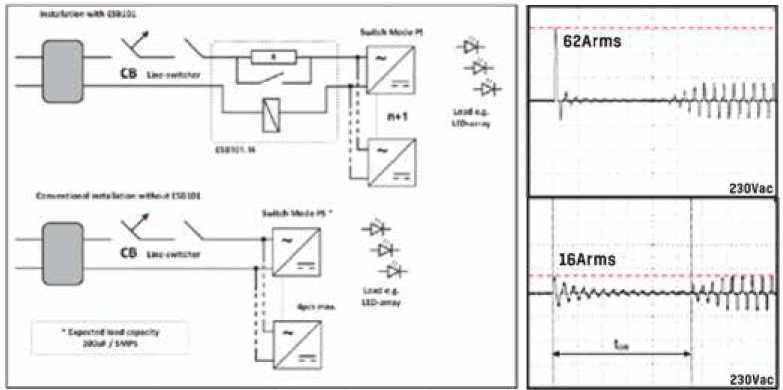En la figura anterior, en la parte del esquema, podemos ver una conexión típica estándar de varios controladores sin ningún tipo de ICL. A ello corresponde la gráfica de la derecha (parte superior), donde se pueden alcanzar valores de pico de hasta 10 kA, o 7 kA rms que, en la mayoría de casos, activarán y dispararán las protecciones instaladas (nuestro magneto-térmico). En el esquema donde se aprecia el ICL, podemos ver que los valores de corriente de pico son 24,8 A rms, lo cual nos aporta información del valor del resistor interno. Lo más remarcable es que la reducción del valor de A rms respecto a una instalación habitual.