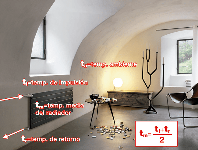 Siendo tm la temperatura media del radiador. Es decir, la media entre temperatura de impulsión ti y temperatura de retorno tr: