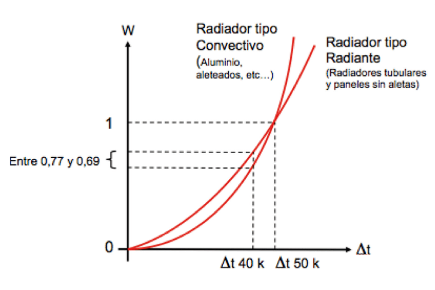 Un radiador emite calor por radiación y por convección. Al bajar la temperatura de funcionamiento la parte que más se mantiene es la de radiación. En función de si el radiador es más bien de tipo radiante o convectivo, su potencia a ∆t 40k se reducirá en un factor de 0,77 para los radiantes o de 0,69 para los convectivos. En ambos casos, la potencia del radiador se mantiene significativamente y siguen siendo válidos. Además, como la relación radiación/convección mejora, el radiador es cada vez más radiante y da un calor más confortable.