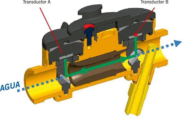 Un contador de Energía Ultrasonido usa un caudalímetro ultrasonido sin partes móviles que permite medir el caudal de agua que pasa a través de la tubería mediante la medida del tiempo entre la transmisión y la recepción de una señal ultrasónica. A modo de ejemplo, el medidor de la imagen se compone de 2 transductores acústicos y de 2 espejos que envían una señal acústica entre sí. El transductor acústico “A” emite una señal acústica que recibe el transductor acústico “B” y este a la vez emite otra señal en sentido inverso. Se mide la diferencia de tiempo entre la ida y la vuelta de la señal y se calcula el caudal de agua que pasa en la tubería: