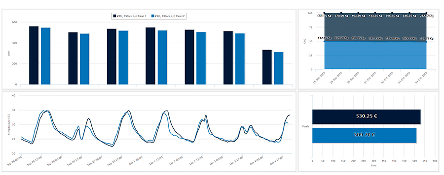 Completando la tecnología inverter DC y su implementación en las aplicaciones mencionadas, se encuentra la plataforma de IoT ofrecida por CAREL, que transforma los datos adquiridos en información útil para todo tipo de usuarios, presentados en gráficos y tablas fácilmente comprensibles. Esto permite reducir el coste de mantenimiento y los algoritmos de mantenimiento predictivo, el análisis de la energía y la optimización del sistema son mucho más simples e intuitivos.