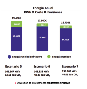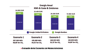 Las unidades presentan un consumo de energía anual de entre 139.167kWh y 161.667kWh, lo que supone un coste energético de entre 16.700€ y 19.400€. La reducción de emisiones entre el escenario 1 y el 7 es de 33%.