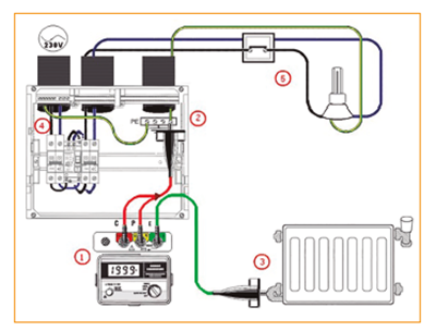 >Puenteando el conductor de protección con el conductor de fase o el neutro en el cuadro general, y midiendo directamente con el equipo multifunción en todos los puntos de carga, es decir, en todas las tomas de corriente y puntos de luz.