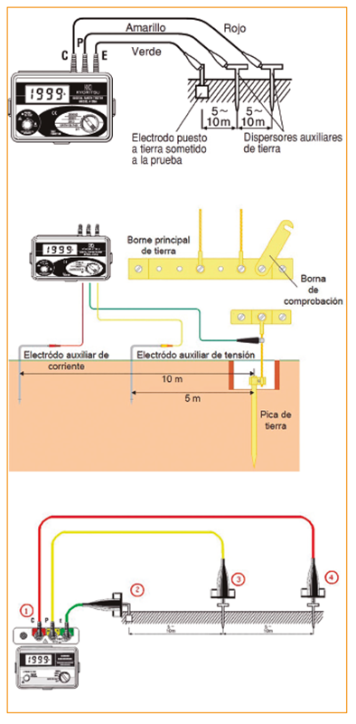 Ejemplo procedimiento a seguir en la Medición Normal (medida de la caída de tensión) de la Resistencia de Tierra (con equipos Kyoritsu):