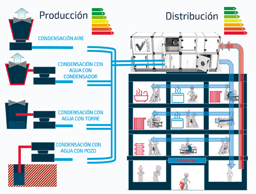 La eficiencia de un edificio está afectada por dos grandes bloques, por un lado, la producción de energía y por otro la distribución de energía al interior del edificio. La elección de ambas partes debe realizarse de manera conjunta y coherente, pues un edificio será tanto más eficiente cuanto más se hayan considerado la relación entre producción y distribución. Para obtener resultados comparables, se realizó el estudio partiendo de una misma tecnología en los grupos de producción de frio (tipo de compresor y regulación del mismo).